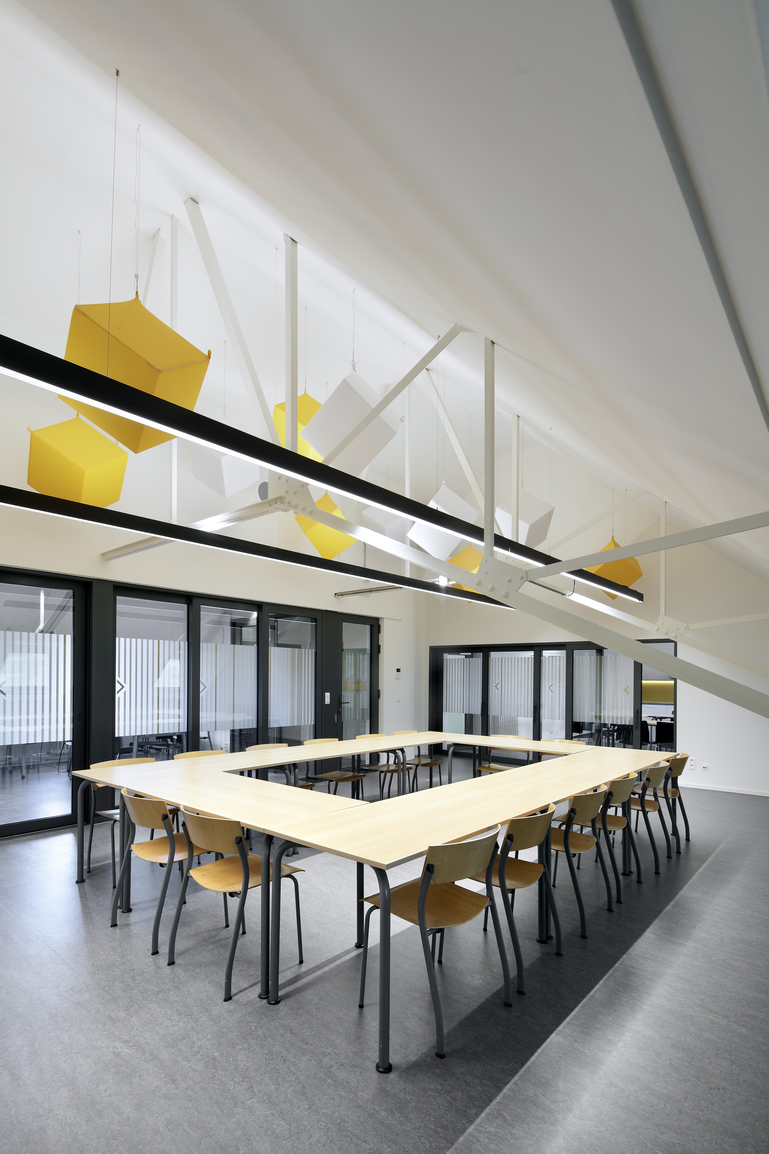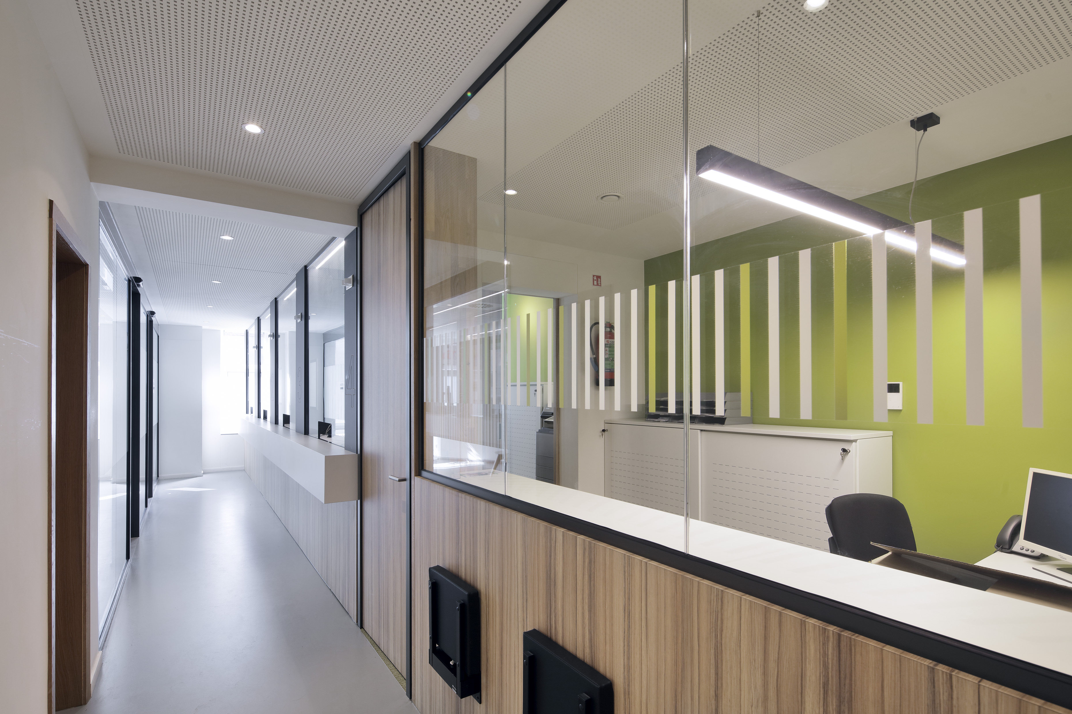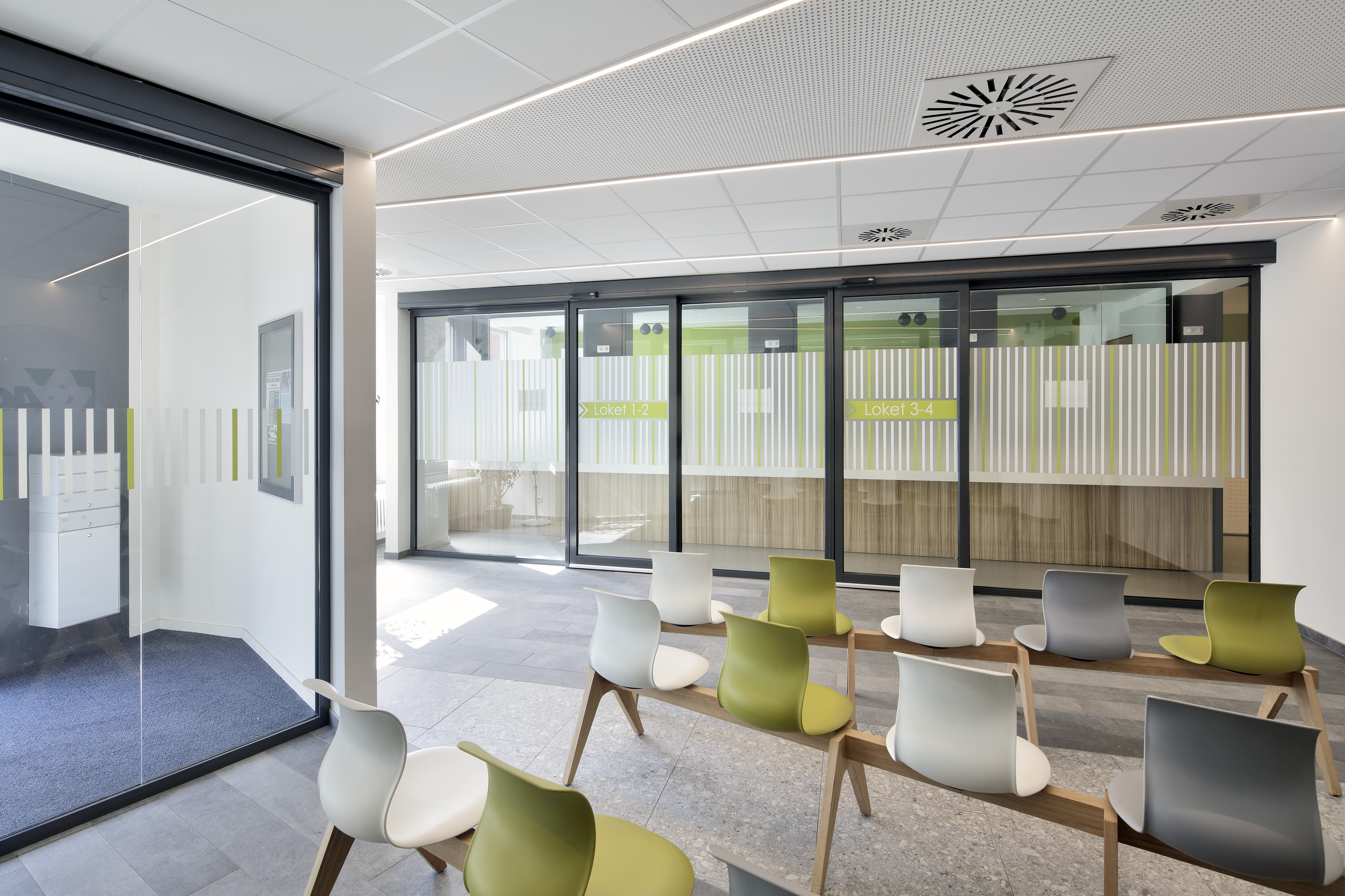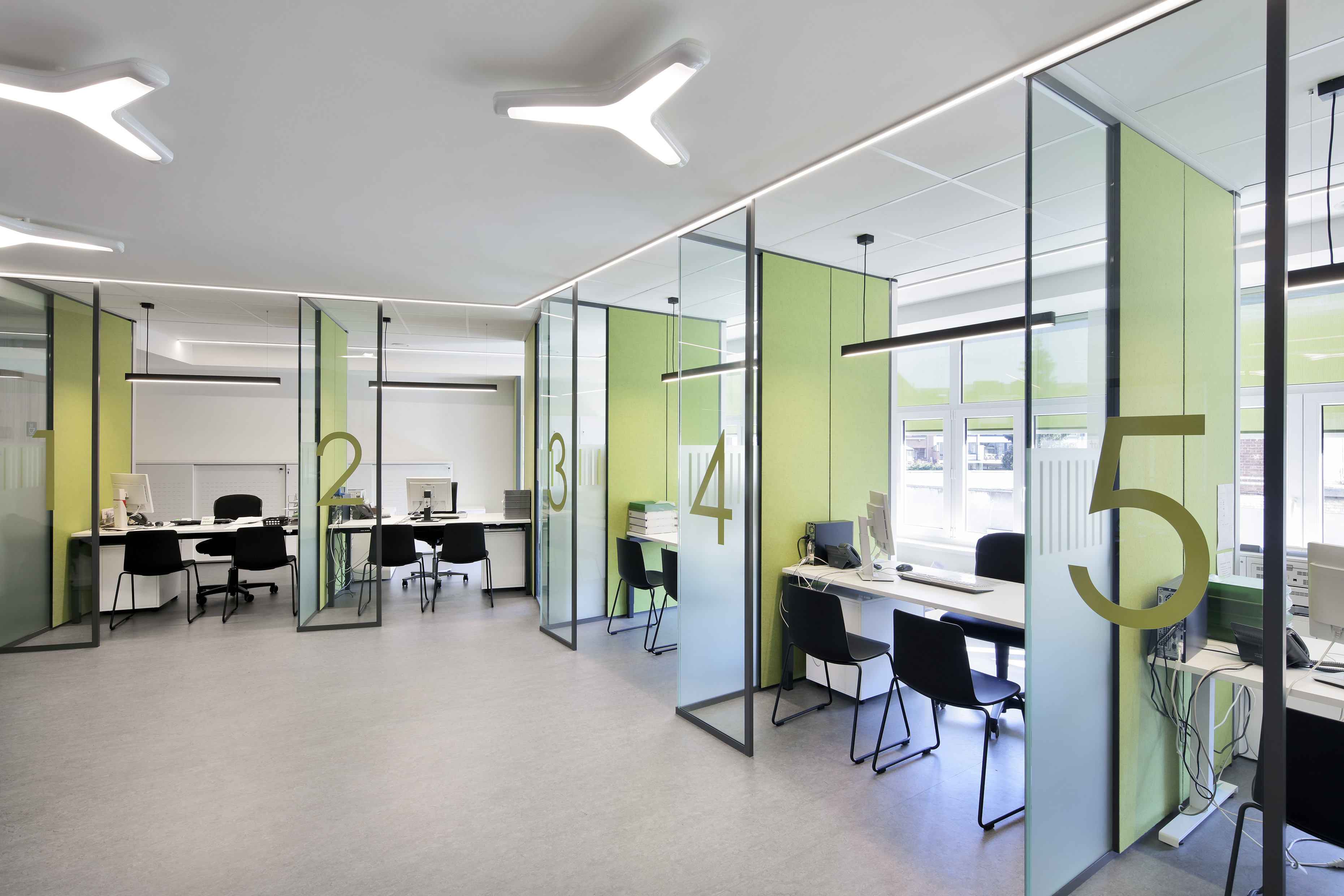 Le projet consistait à rénover et réaménager un centre de services sur trois niveaux, comprenant cinq guichets d'acceuil, six bureaux d'acceuil, deux salles de réunion, un réfectoire, deux kitchenettes et des sanitaires.
