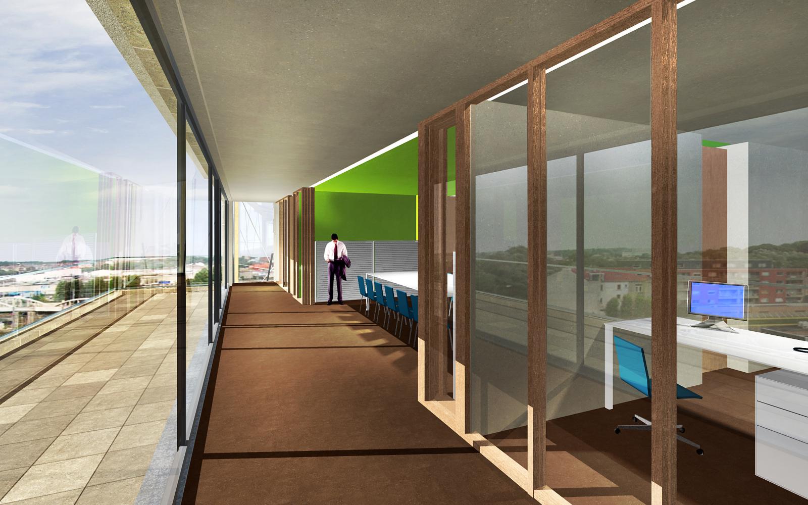 Drie bestaande plateaus op de vierde, vijfde en zesde verdieping worden volledig ontmanteld en opnieuw ingericht. Tussen de vierde verdieping van het hoofdgebouw en het achterliggende parkeergebouw komt een overdekte doorgang. Op de vijfde verdieping wordt het gebouw uitgebreid met een cafetaria, ondergebracht in een glazen volume met panoramisch karakter.