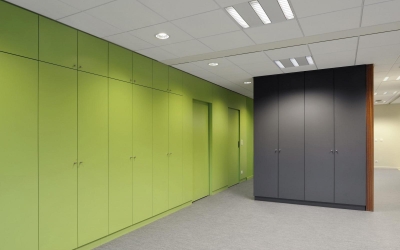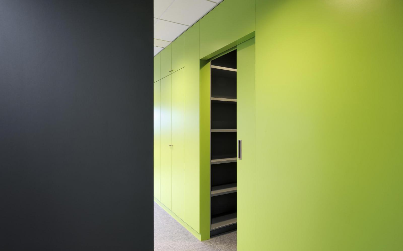 Alle verlaagde plafonds tussen muren en omkastingen zijn weggehaald. De ruimte werd opnieuw ingericht tot een open en licht kantoor. Een schuine wand is weggewerkt met behulp van een lange kastenwand tegen de gemene muur. Daardoor voelt de ruimte evenwichtiger aan en ontstond er bergruimte voor alle technische en sanitaire ruimten, archief en andere. Binnen het neutrale en rustige kleurenpalet fungeert de kast als blikvanger door de afwerking in een warme, felle groene tint.