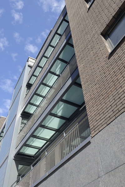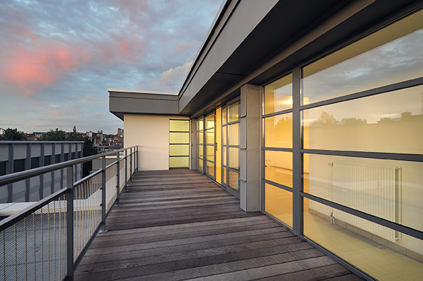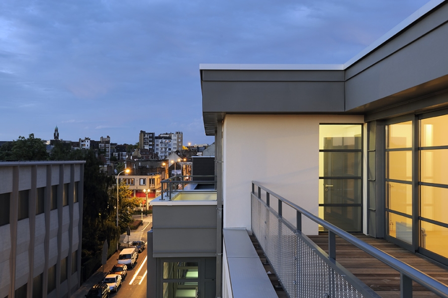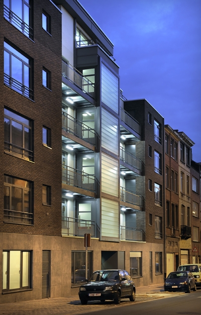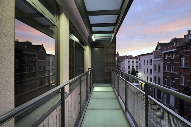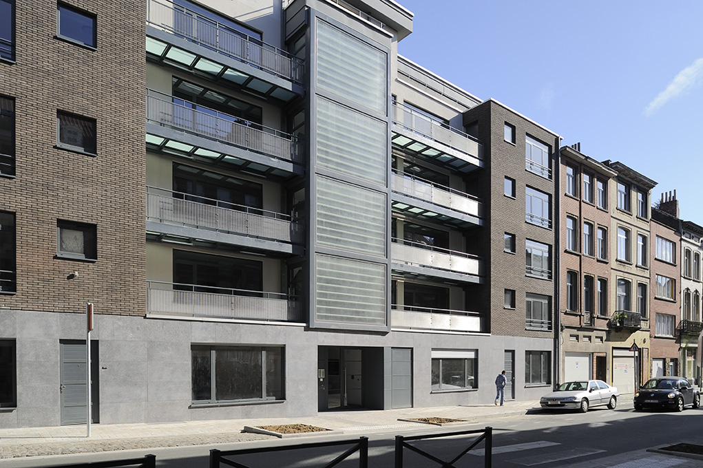 Een enkele centrale verticale circulatie bedient per verdieping alle – ook de meest extreem gelegen - appartementen via externe loopbruggen in staal en glas. De bewoners kunnen die passerelles in de zomer benutten als terras. Een van de appartementen op het gelijkvloers is afgestemd op rolstoelgebruikers.