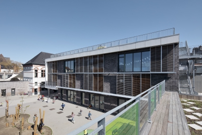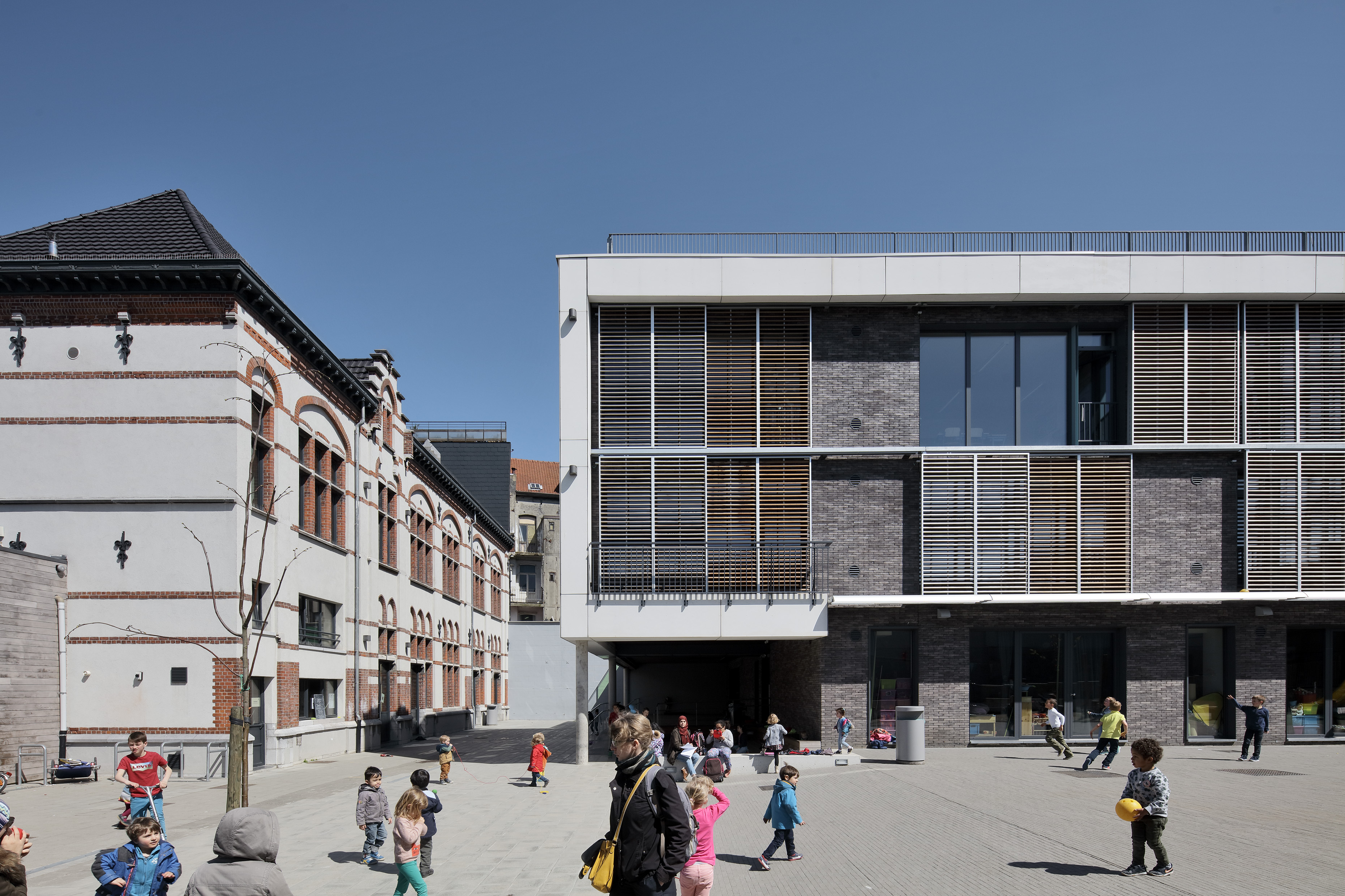 Het passiefgebouw is gebaseerd op een stevige thermische isolatie van 20 cm en een luchtdichte afwerking. Een ventilatiesysteem D staat in voor een continue afvoer van vervuilde en toevoer van verse lucht. De lange, zuidwaarts gerichte gevel is met glas ingevuld, zodat in de winter optimale zonnewinsten kunnen worden gehaald. Een zonwering verzekert het gebruikscomfort in de zomer. De meeste daken zijn ingevuld als groendak. De resterende oppervlakte wordt benut voor de recuperatie van regenwater, dat wordt hergebruikt voor het spoelen van de toiletten. Alle functies zijn gegroepeerd rond een nieuwe, grote speelplaats. Enkele nieuw aangeplante, hoogstammige bomen brengen de natuur binnen handbereik.