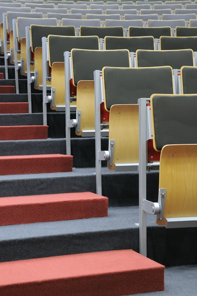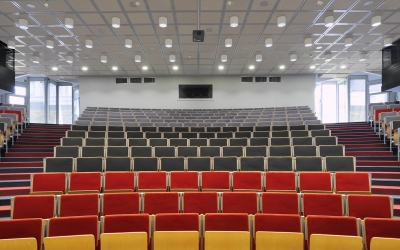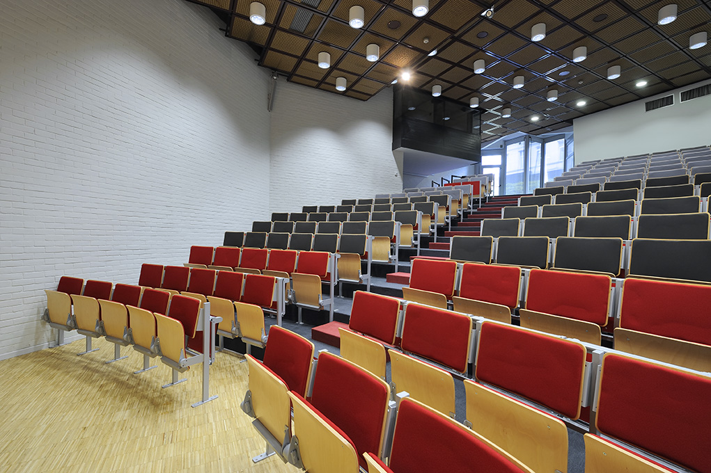 In laatste instantie kreeg de aula een nieuwe, frisse look en een technische update. Door ruim aandacht te besteden aan de akoestiek en de verlichting, werd gestreefd naar een optimale plek voor lezingen Het zware meubilair wordt vervangen door gestoffeerde stoelen met goede akoestische eigenschappen en een aangenaam zitcomfort. De pertinent aanwezige, bruine baksteenwanden worden in een lichtere tint geschilderd, zodat de geesten fris geconcentreerd kunnen blijven op de lezingen.