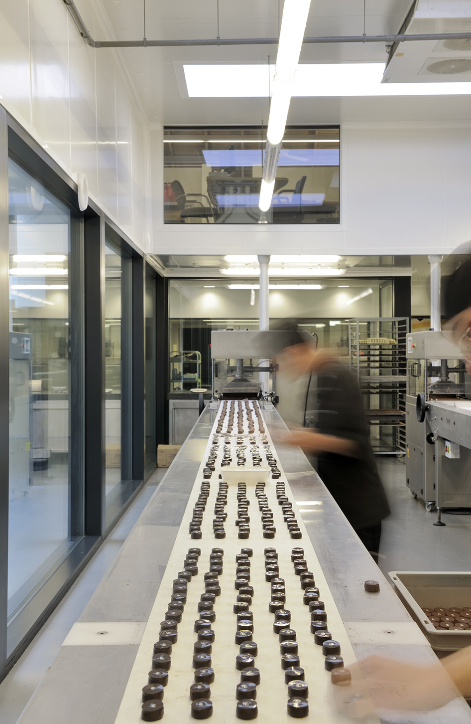 In de ateliers daarentegen kon de dakstructuur niet zichtbaar worden gelaten. Omdat hier om technische en hygiënische redenen een constante temperatuur van 15° C moet heersen, werden de atelierruimtes volledig geïsoleerd en afgesloten van het tentoonstellingsgedeelte. Uiteraard is ook rekening gehouden met de strenge HACCP normen voor de productiestromen (vuile en propere zones).