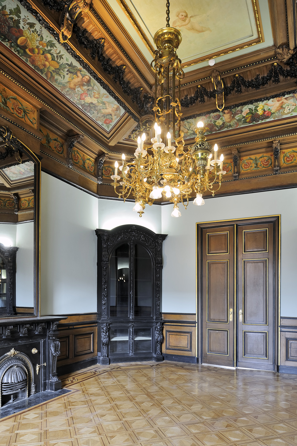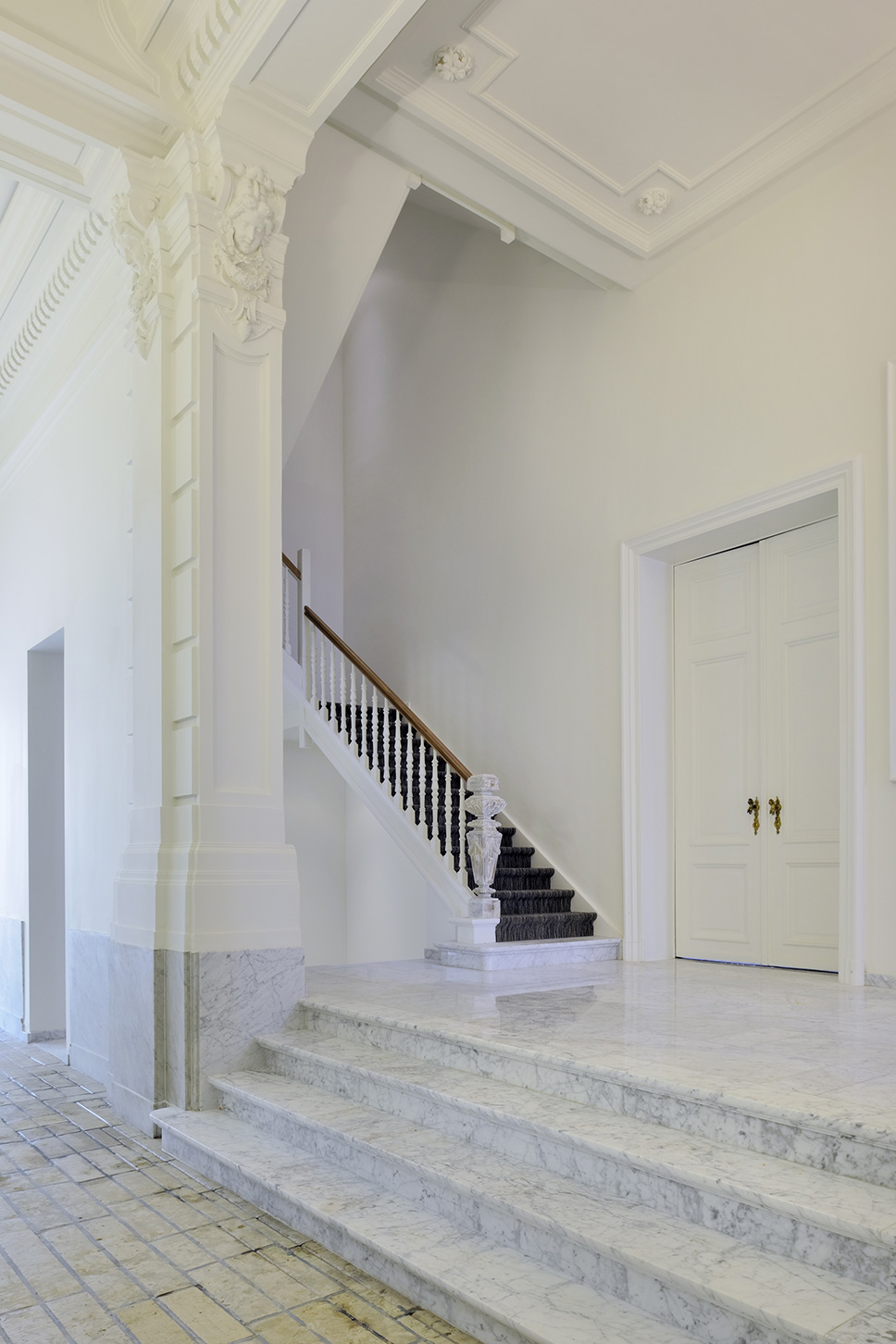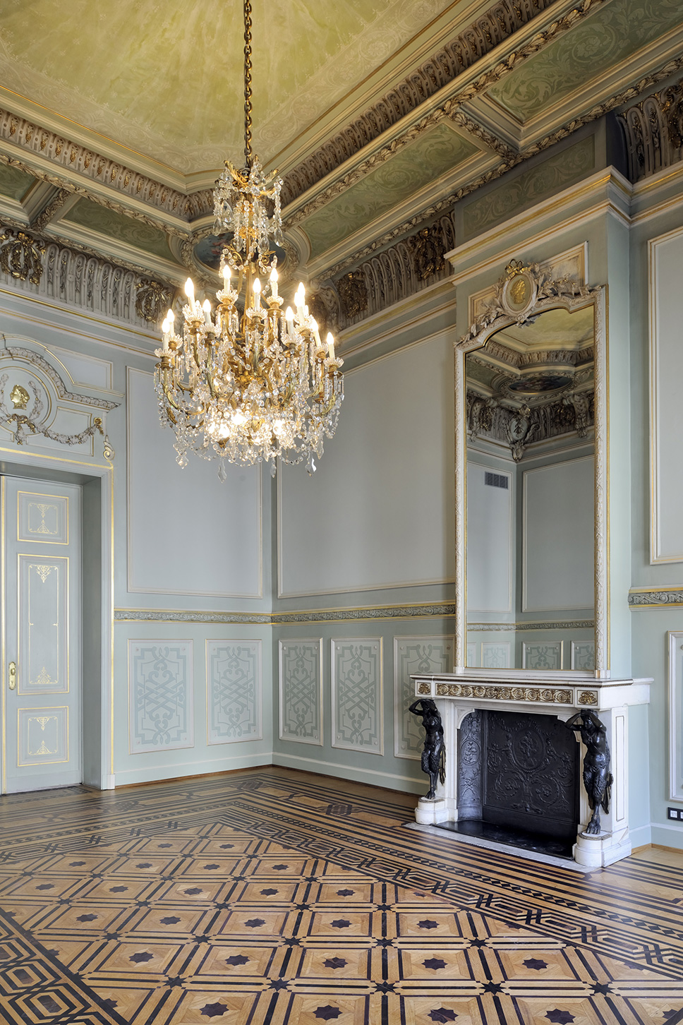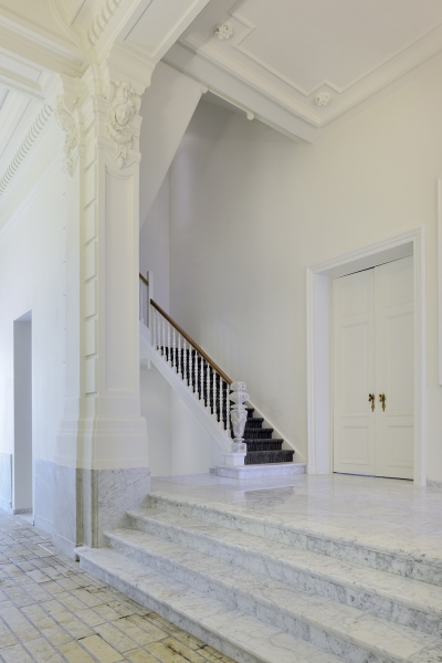 In vijf salons waren nog de oorspronkelijke decoraties uit 1870 aanwezig. Wel waren tussen de lambrisering verschillende lagen behangpapier aangebracht, waarvan de oudste laag dateerde uit 1920 en de meest recente uit 1980. Het behangpapier, de radiatoren en de in opbouw geplaatste elektrische leidingen werden verwijderd en de plafonds en wanden gereinigd. Om leidingen voor elektriciteit en data te kunnen plaatsen, werden op bepaalde plaatsen ook de plinten weggehaald en nadien weer teruggeplaatst. Ontbrekende zaken werden hersteld, zoals een deel van de plafondspiegel die rond 1985 naar beneden was gevallen.De bronzen deurgrepen en slotplaten waren nog grotendeels intact. Zij werden gereinigd en langs de zijde van de trapzaal aangevuld met strak roestvrijstalen deurbeslag. De elektrische luchters werden herbekabeld, grondig gereinigd en uitgerust met nieuwe gloeilampen. Zij zijn niet oorspronkelijk, want in 1870 was nog geen elektriciteit beschikbaar. De luchters die aanvankelijk waarschijnlijk aanwezig waren, werkten op stadsgas dat rond 1840 beschikbaar was in de meeste Europese steden, waaronder Brussel.