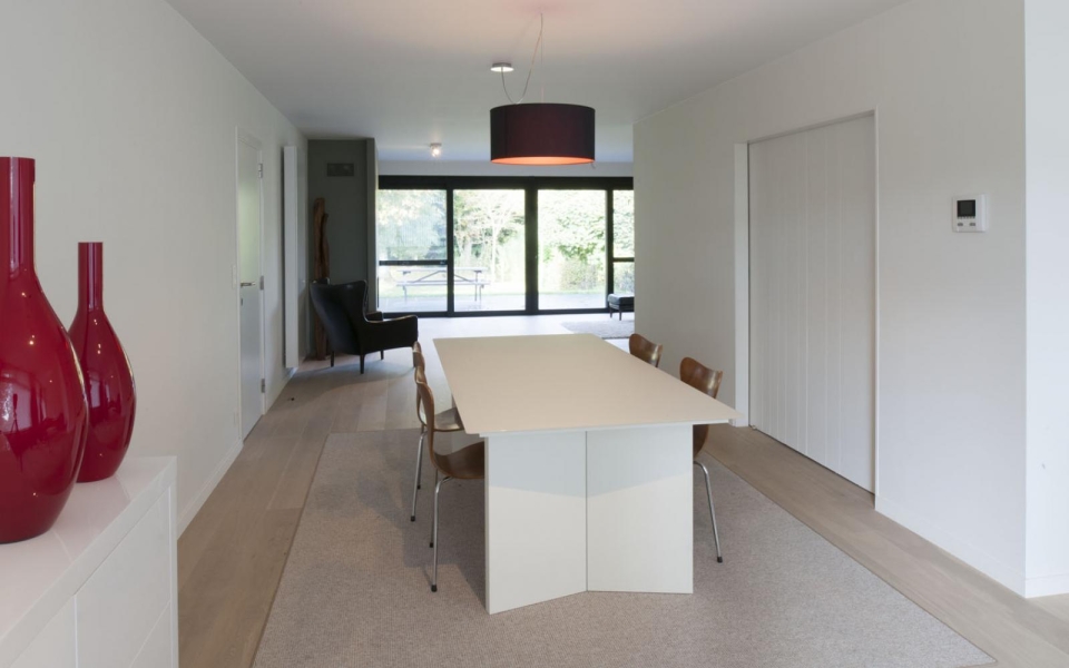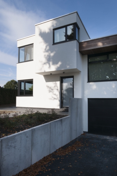 Een bestaande vrijstaande woning in Heusden werd gerenoveerd. Het L-vormige volume met één woonlag was gedeeltelijk onderkelderd en omgeven door een fraaie tuin. Aanvankelijk gensden de slaapkamers aan de achtergevel, waardoor de leefruimte enkel in contact stond met de straat en niet met de tuin. Om de woning te restylen tot een modern huis met voldoende licht en mooie uitzichten werd het grondplan volledig hertekend en werd een kleiner volume met twee bouwlagen in split-level toegevoegd. De nieuwe leefruimte werd geplaatst rondom de bestaande keuken die behouden bleef en strekt zich uit van de voor- tot de achtergevel. Daardoor staat de nieuwe natuurlijk verlichte ruimte rechtstreeks in contact met de tuin en het nieuwe terras.