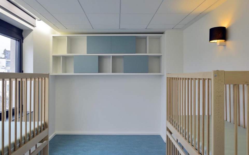 Door de slechte inplanting van de lokalen werd de beschikbare oppervlakte niet optimaal benut. Door een grondige reorganisatie kwam er op elke verdieping dan ook plek vrij voor telkens twee extra, grote en goed van daglicht voorziene dagverblijflokalen aan de voor- en achtergevel. Centraal zitten op elke verdieping een ruimte met kastjes waar de privéspullen van de kinderen kunnen worden weggeborgen, en een badkamer met sanitair voor de verzorging van de baby’s en peuters. Op de derde en vierde verdieping werd het gebouw uitgebreid. De derde verdieping is ingevuld zoals de andere. De vierde etage biedt plaats aan de personeelslokalen, een vergaderzaal met terras en een grootkeuken die beantwoordt aan de HACCP vereisten. Op het gelijkvloers geven grote ramen het daglicht vrij baan tot midden in het gebouw. Dat geeft de hoofdingang en het secretariaat een heel onthaalvriendelijk karakter.
