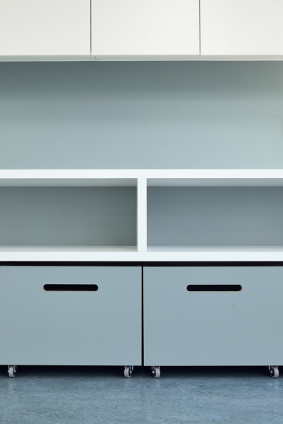 Verschillende kleuraccenten per verdieping geven het gebouw een eigen karakter en loodsen de ouders en de kinderen naar de juiste bestemming. Elke verdieping staat daarmee ook voor een herkenbaar thema. Het groen op de eerste verdieping stelt het gras voor, het blauw op de tweede verdieping de lucht en het oranje op de derde verdieping is de kleur van de zon.