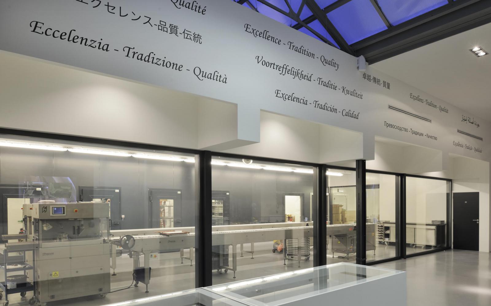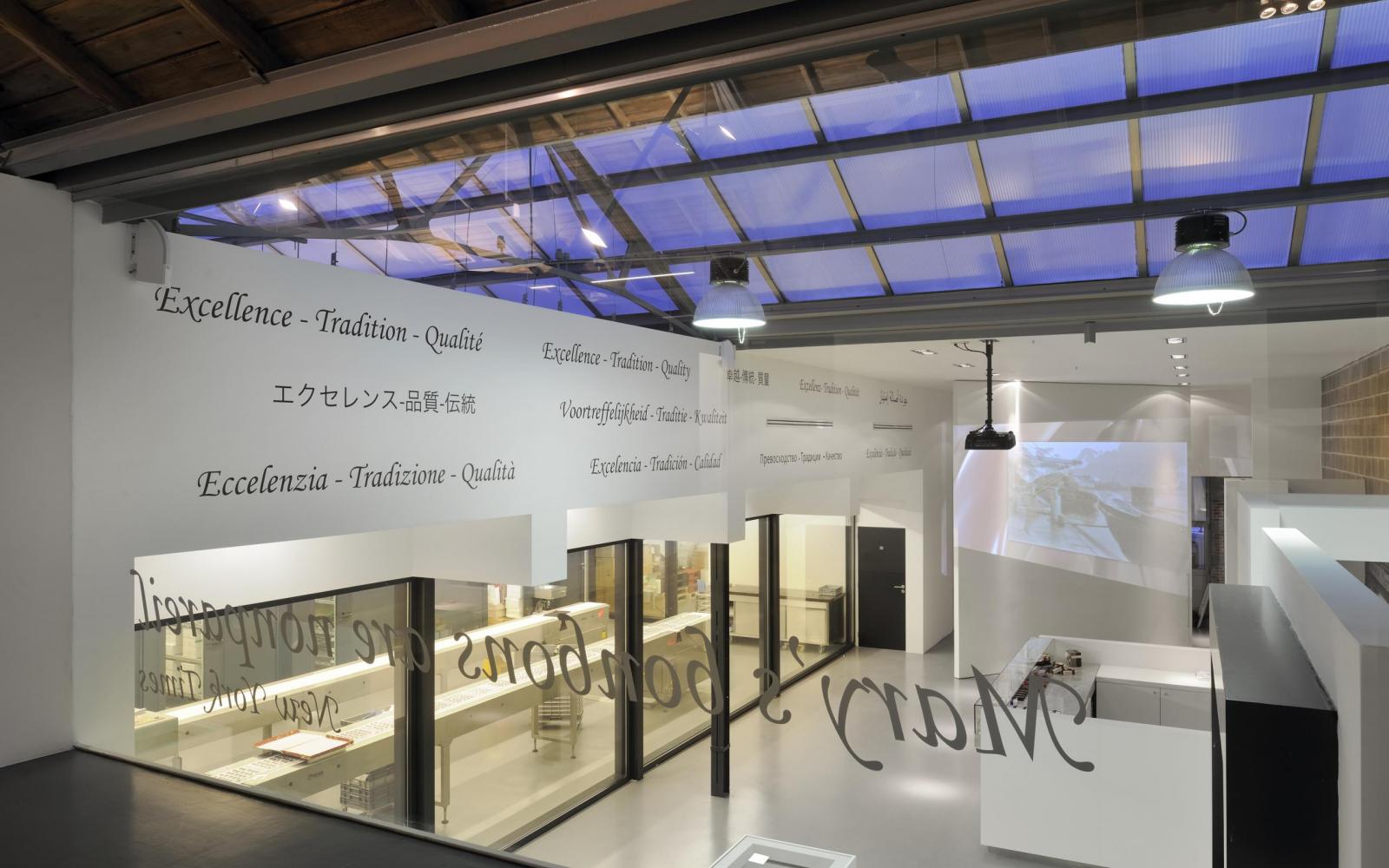 Dans les ateliers par contre, la structure de toit originale n’a pas pu être conservée. Comme une température constante de 15° C doit être maintenue dans ces espaces pour des raisons techniques et hygiéniques, ils sont complètement isolés et séparés des espaces d’exposition. Et il fut également tenu compte des normes HACCP sévères pour les flux de production (zones propres et zones sales).