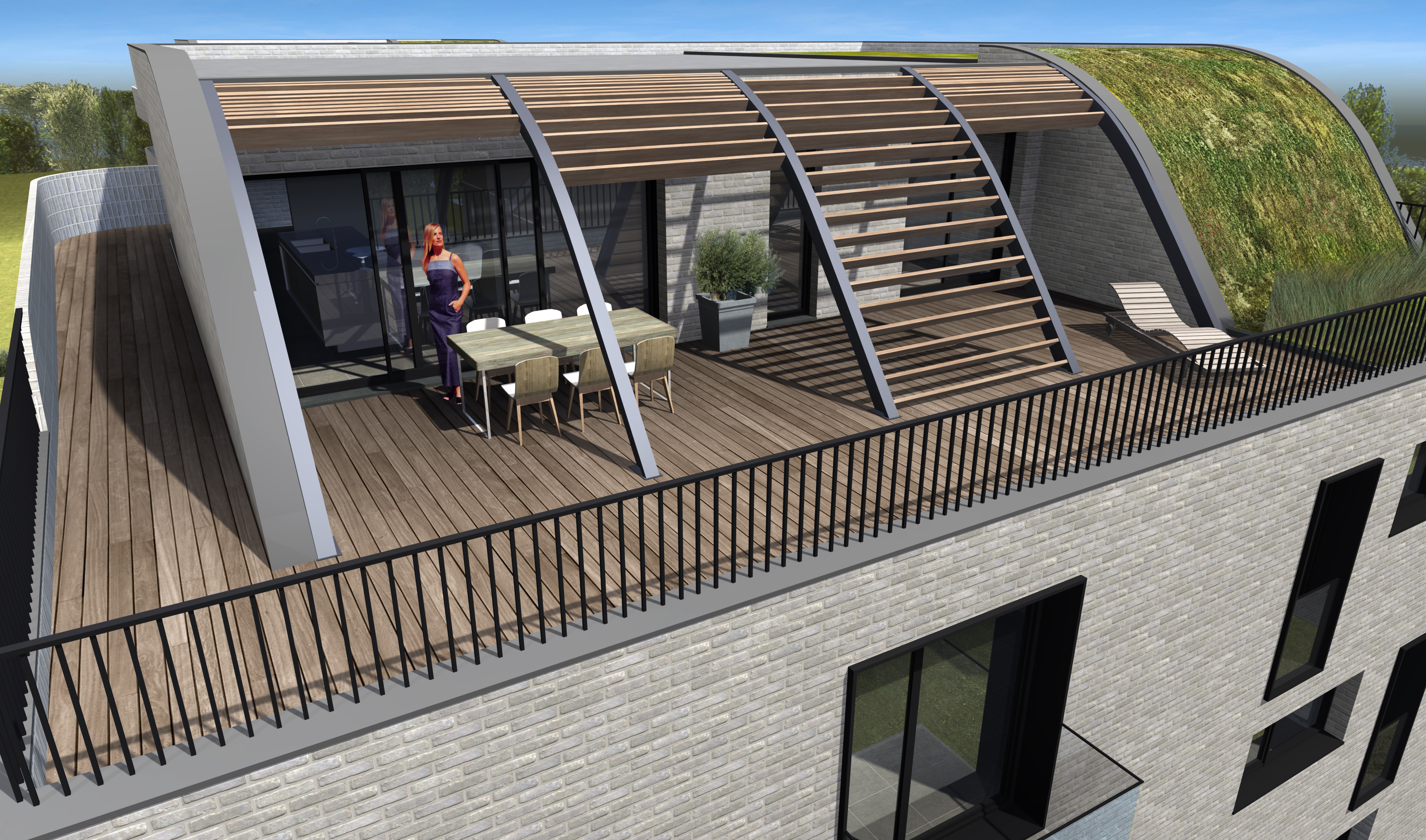 De speelse raamopeningen, uitspringende terrassen, gebogen vormen en uitkragende gevelvlakken geven de bouwvolumes een apart en hedendaags karakter.