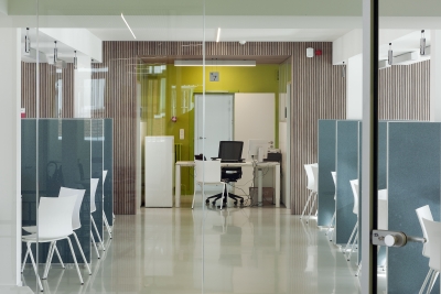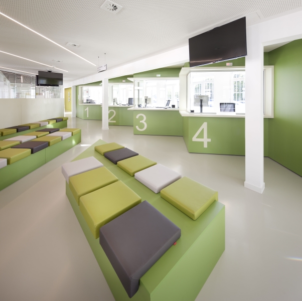 DEWIL architecten ontwierp het interieur van dit dienstencentrum in Jette. In een bestaand gebouw werden op de eerste verdieping 6 loketten met wachtruimte, 13 onthaalburelen, sanitair en een cafetaria voor zowel bezoekers als medewerkers geïntegreerd.