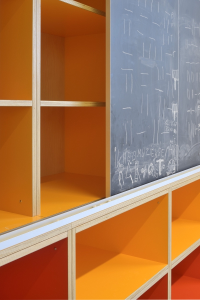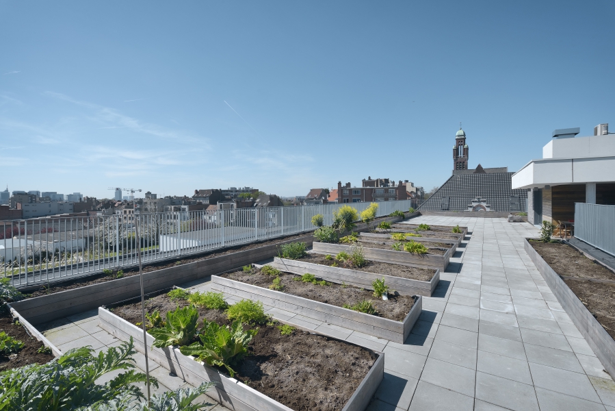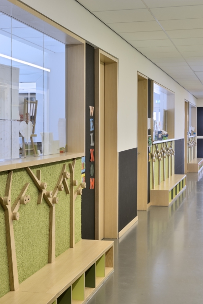 Het passiefgebouw is gebaseerd op een stevige thermische isolatie van 20 cm en een luchtdichte afwerking. Een ventilatiesysteem D staat in voor een continue afvoer van vervuilde en toevoer van verse lucht. De lange, zuidwaarts gerichte gevel is met glas ingevuld, zodat in de winter optimale zonnewinsten kunnen worden gehaald. Een zonwering verzekert het gebruikscomfort in de zomer. De meeste daken zijn ingevuld als groendak. De resterende oppervlakte wordt benut voor de recuperatie van regenwater, dat wordt hergebruikt voor het spoelen van de toiletten. Alle functies zijn gegroepeerd rond een nieuwe, grote speelplaats. Enkele nieuw aangeplante, hoogstammige bomen brengen de natuur binnen handbereik.