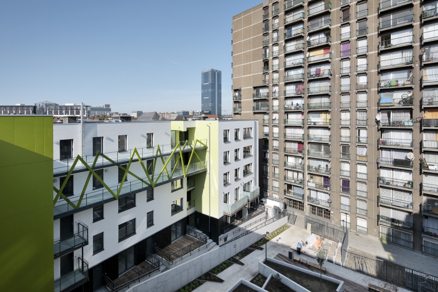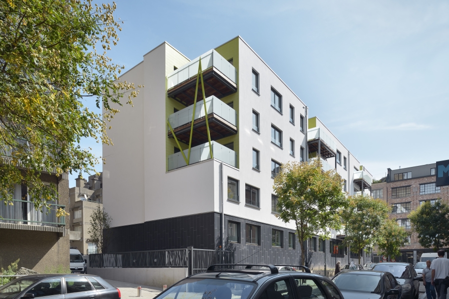 In 2009 schreef de Brusselse Haard een architectuurwedstrijd uit voor de herwaardering van de site “Huidevetters” in hartje Brussel. De opgave omvatte de ingrijpende renovatie van het appartementsgebouw en de heraanleg van het Krakeelplein. Het oude, monolithische appartementsgebouw wordt getransformeerd tot een nieuw, hedendaags gebouw voor sociale huisvesting. De bestaande, piepkleine appartementen worden omgevormd tot nieuwe, open, leefomgevingen die rijmen met de huidige woonnormen.