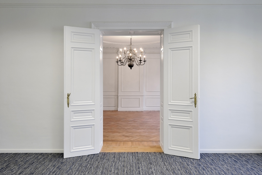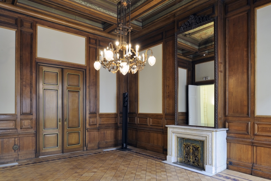 In vijf salons waren nog de oorspronkelijke decoraties uit 1870 aanwezig. Wel waren tussen de lambrisering verschillende lagen behangpapier aangebracht, waarvan de oudste laag dateerde uit 1920 en de meest recente uit 1980. Het behangpapier, de radiatoren en de in opbouw geplaatste elektrische leidingen werden verwijderd en de plafonds en wanden gereinigd. Om leidingen voor elektriciteit en data te kunnen plaatsen, werden op bepaalde plaatsen ook de plinten weggehaald en nadien weer teruggeplaatst. Ontbrekende zaken werden hersteld, zoals een deel van de plafondspiegel die rond 1985 naar beneden was gevallen.De bronzen deurgrepen en slotplaten waren nog grotendeels intact. Zij werden gereinigd en langs de zijde van de trapzaal aangevuld met strak roestvrijstalen deurbeslag. De elektrische luchters werden herbekabeld, grondig gereinigd en uitgerust met nieuwe gloeilampen. Zij zijn niet oorspronkelijk, want in 1870 was nog geen elektriciteit beschikbaar. De luchters die aanvankelijk waarschijnlijk aanwezig waren, werkten op stadsgas dat rond 1840 beschikbaar was in de meeste Europese steden, waaronder Brussel.
