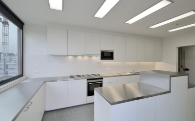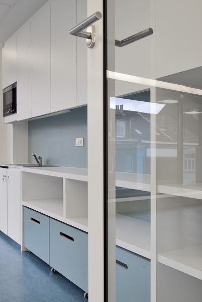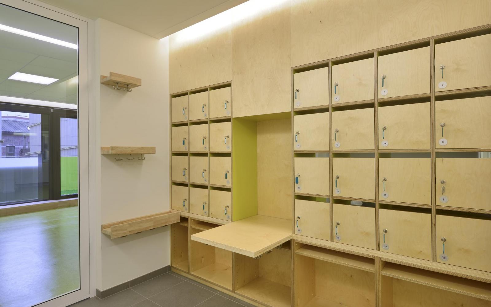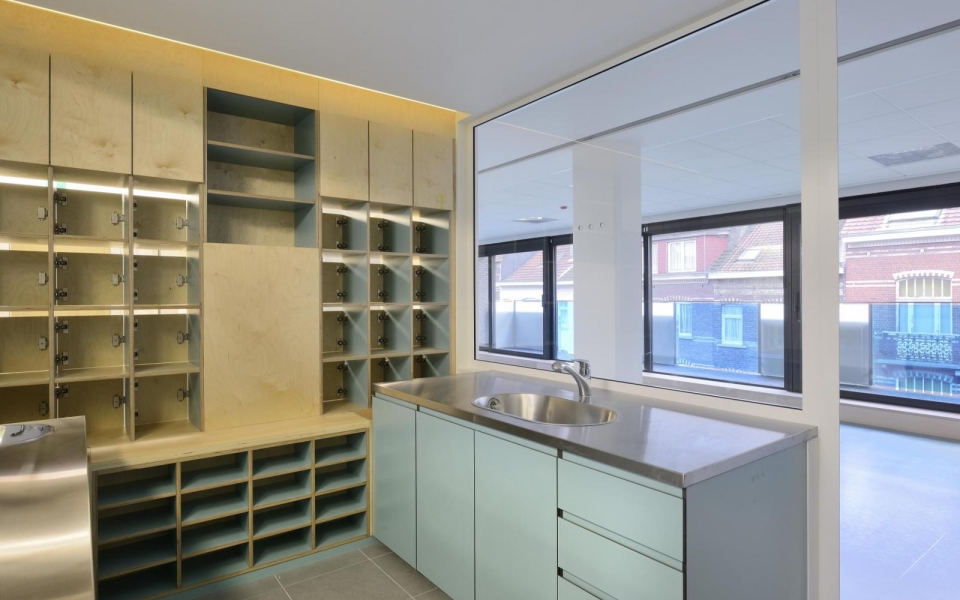 Door de slechte inplanting van de lokalen werd de beschikbare oppervlakte niet optimaal benut. Door een grondige reorganisatie kwam er op elke verdieping dan ook plek vrij voor telkens twee extra, grote en goed van daglicht voorziene dagverblijflokalen aan de voor- en achtergevel. Centraal zitten op elke verdieping een ruimte met kastjes waar de privéspullen van de kinderen kunnen worden weggeborgen, en een badkamer met sanitair voor de verzorging van de baby’s en peuters. Op de derde en vierde verdieping werd het gebouw uitgebreid. De derde verdieping is ingevuld zoals de andere. De vierde etage biedt plaats aan de personeelslokalen, een vergaderzaal met terras en een grootkeuken die beantwoordt aan de HACCP vereisten. Op het gelijkvloers geven grote ramen het daglicht vrij baan tot midden in het gebouw. Dat geeft de hoofdingang en het secretariaat een heel onthaalvriendelijk karakter.