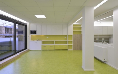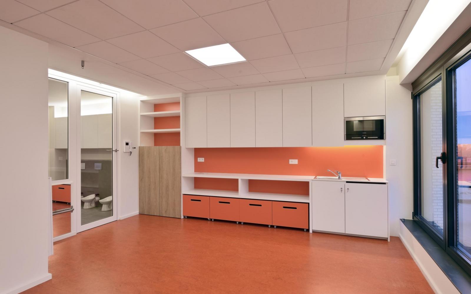Het kinderdagverblijf ’t Helmetje in Schaarbeek is ondergebracht in een gebouw uit de jaren 1970. Bedoeling was niet alleen een verhoging van de opvangcapaciteit, maar ook een herinrichting conform de meest recente normen en reglementen betreffende de veiligheid en het comfort van de kleine gebruikers.