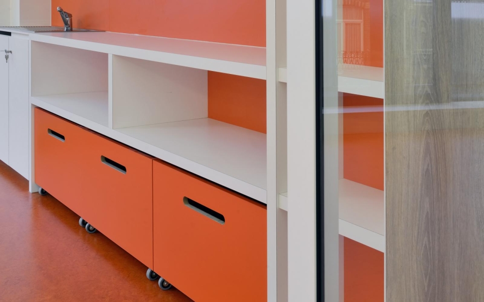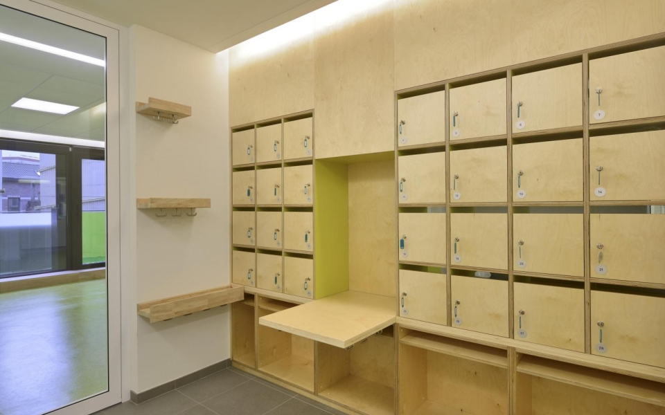 Verschillende kleuraccenten per verdieping geven het gebouw een eigen karakter en loodsen de ouders en de kinderen naar de juiste bestemming. Elke verdieping staat daarmee ook voor een herkenbaar thema. Het groen op de eerste verdieping stelt het gras voor, het blauw op de tweede verdieping de lucht en het oranje op de derde verdieping is de kleur van de zon.