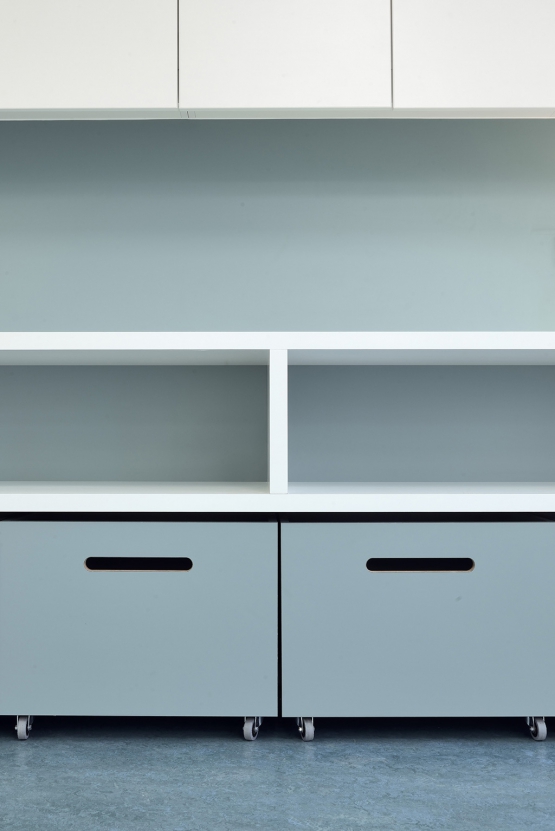 Verschillende kleuraccenten per verdieping geven het gebouw een eigen karakter en loodsen de ouders en de kinderen naar de juiste bestemming. Elke verdieping staat daarmee ook voor een herkenbaar thema. Het groen op de eerste verdieping stelt het gras voor, het blauw op de tweede verdieping de lucht en het oranje op de derde verdieping is de kleur van de zon.