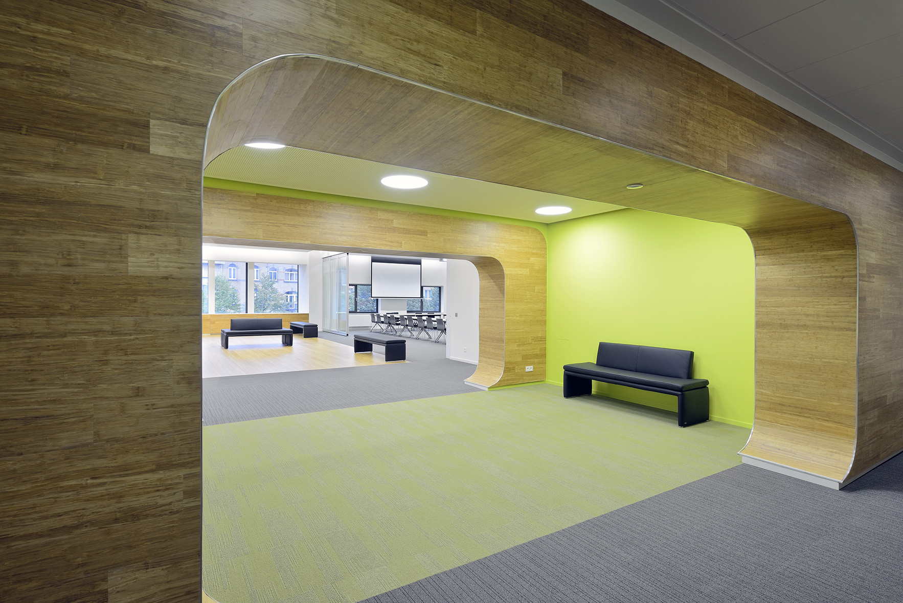 L’entrée des salles de réunion est ponctuée de meubles vestiaires d’un vert très frais, dans lesquels des écrans sont intégrés.
