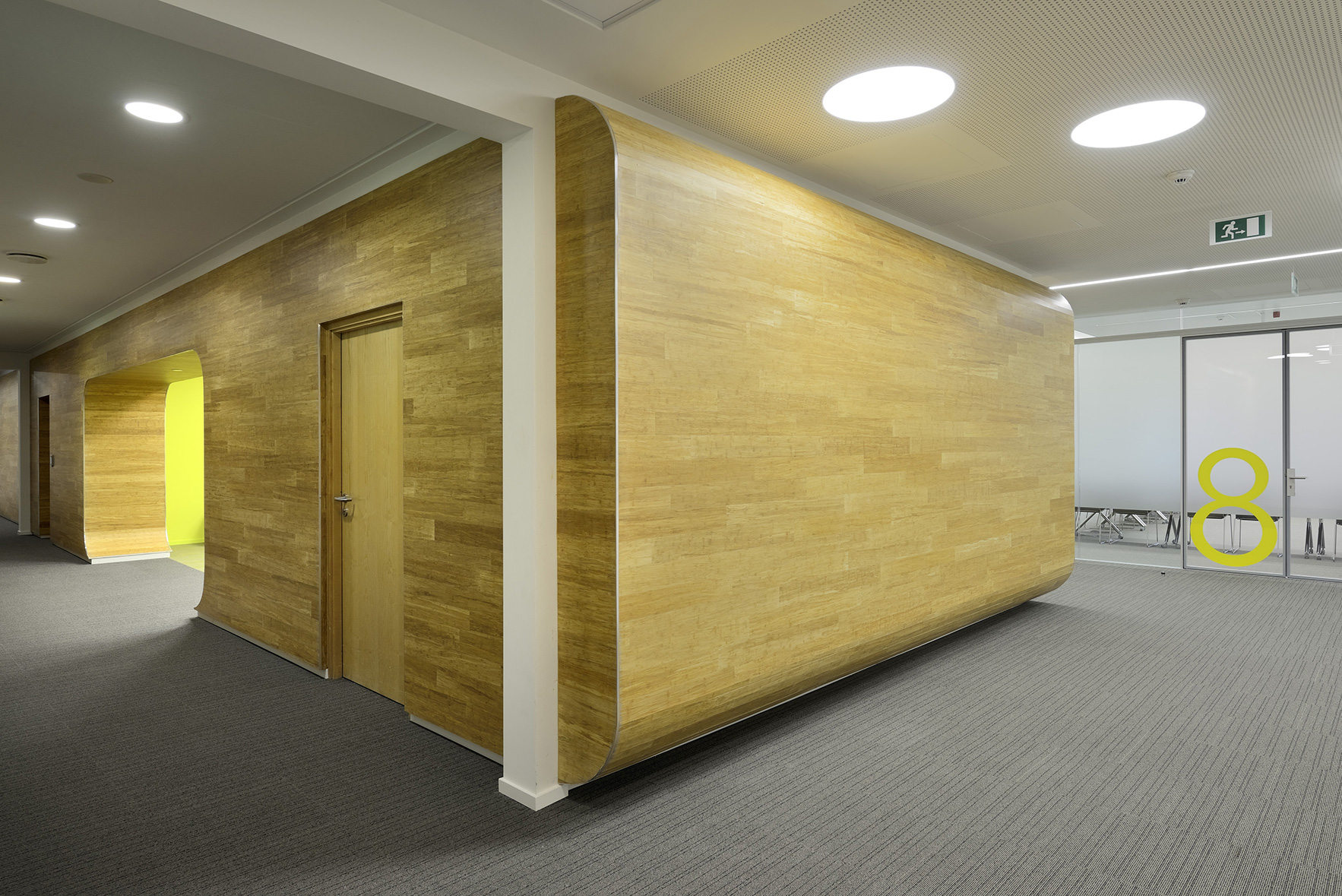 Les espaces techniques existants au centre du bâtiment sont revêtus, comme un meuble, de placage bambou qui ajoute une note chaleureuse à l’intérieur. On retrouve le même matériau dans le foyer central qui traverse le mobilier technique. L’emploi des coloris et les armatures lumineuses rondes, implantées de façon ludique, créent une ambiance plus intime.