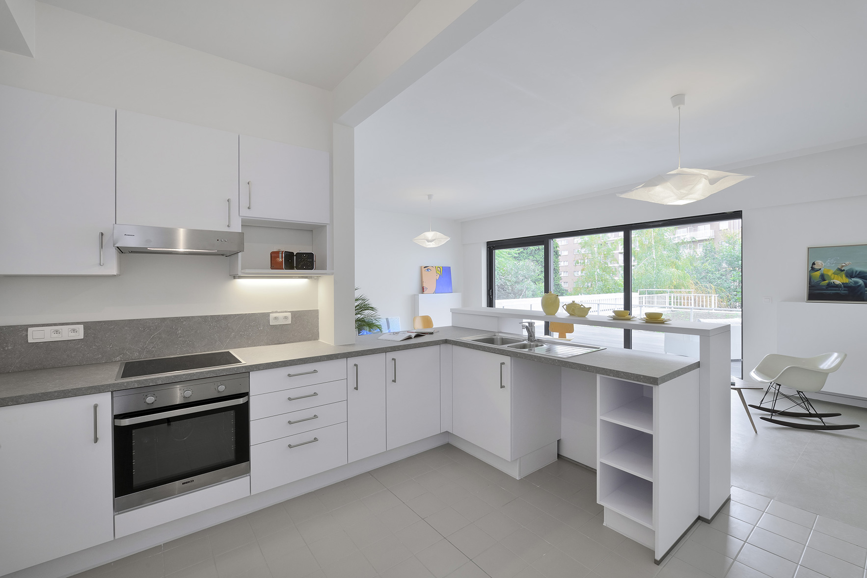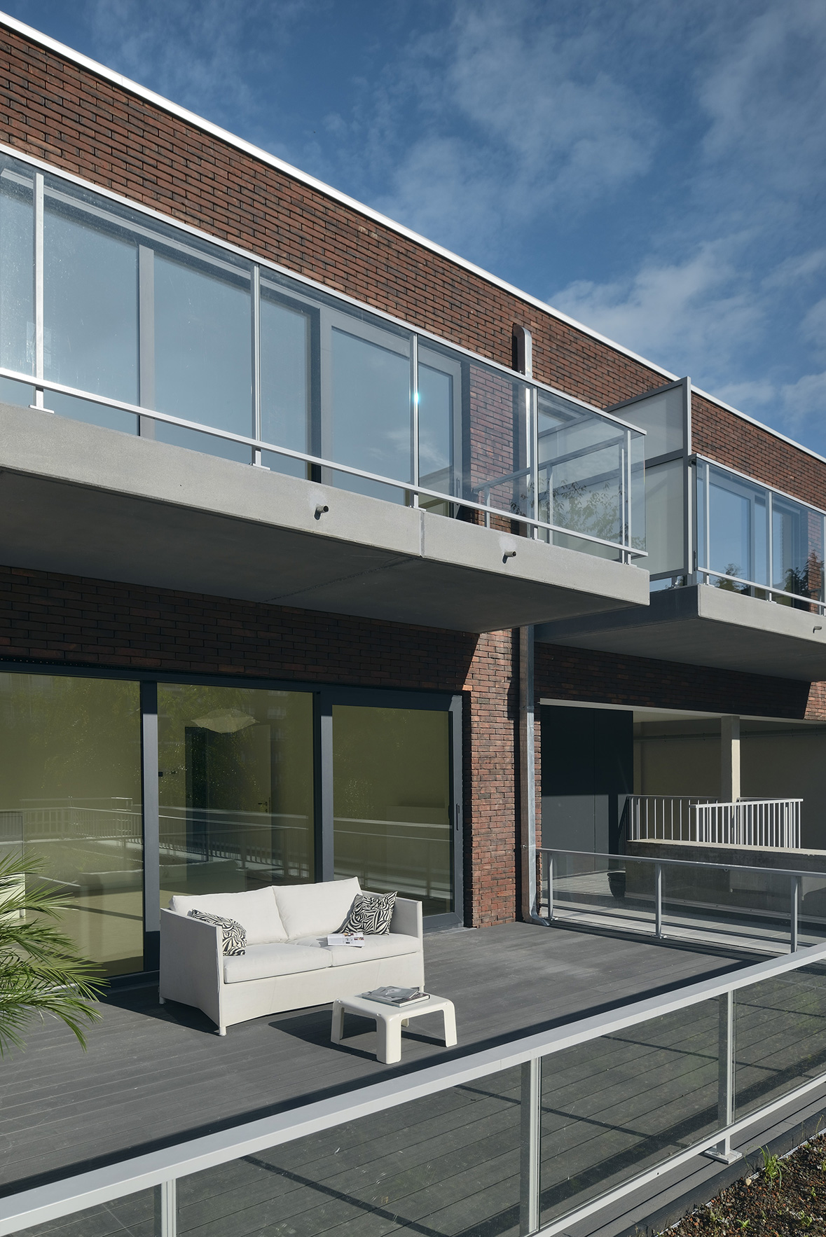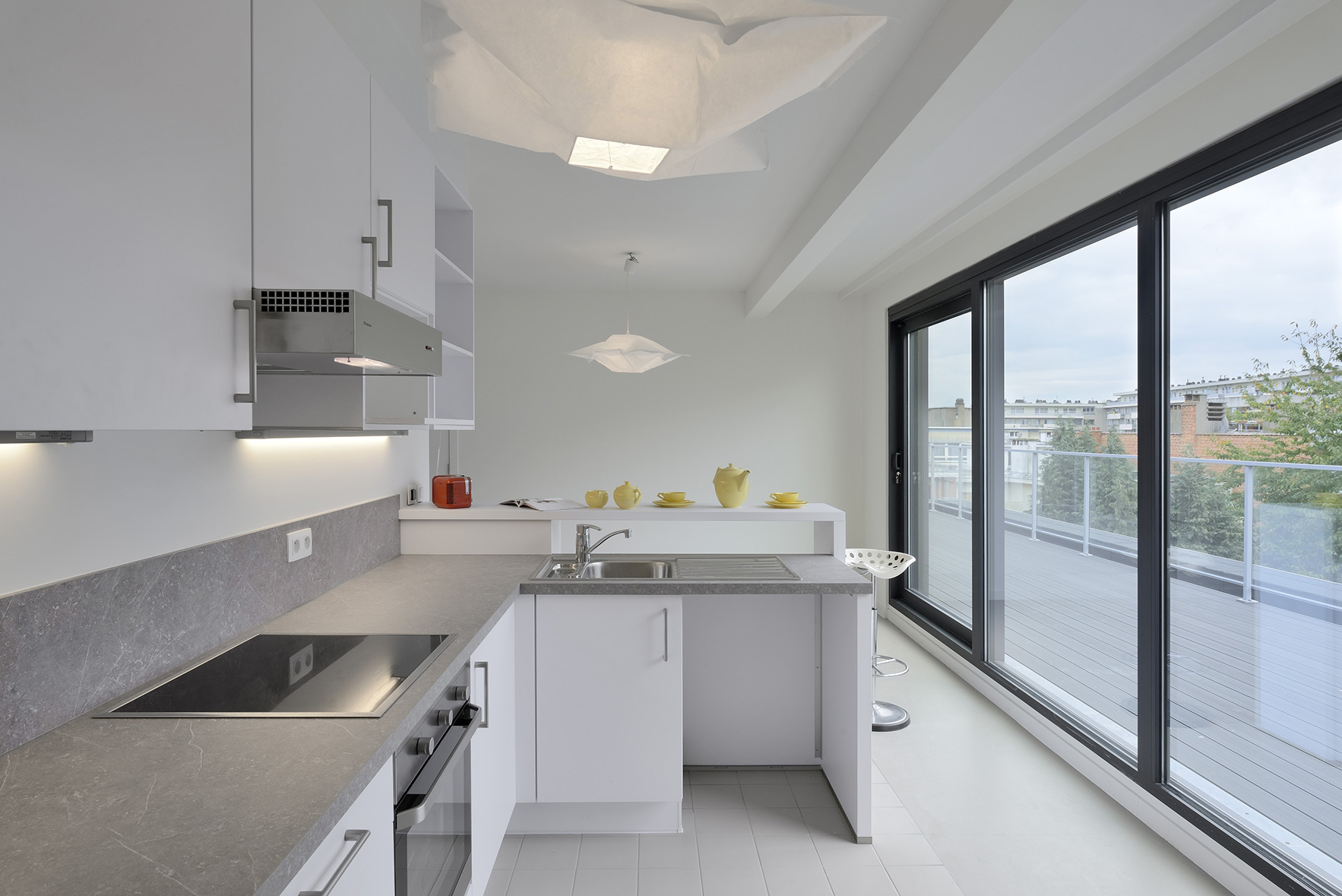 De doorzonappartementen zijn zowel naar de straatzijde als naar de tuin georiënteerd. De zuidgeoriënteerde achtergevel doet de terrassen in het zonlicht baden. De leefruimtes leunen aan tegen de achtergevel en ontvangen rijkelijk daglicht via grote glaspartijen.